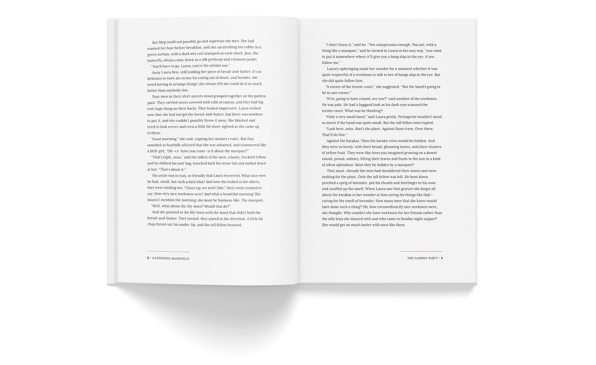 Book design for a course at the University of Baltimore. “The Garden Party” is a realist short story about class issues, and I wanted the book to have a sense of foreboding. Moody pastels and thick florals give way to the interior of the story. It was set in a variation of the classic book type Baskerville. It was printed and bound by Blurb.com, with dust jacket by Columbia, MD-based Indigo Ink.
